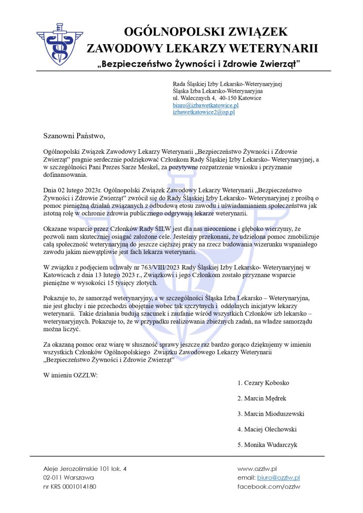 Podziękowania skierowane do Śląskiej Izby Lekarsko-Weterynaryjnej