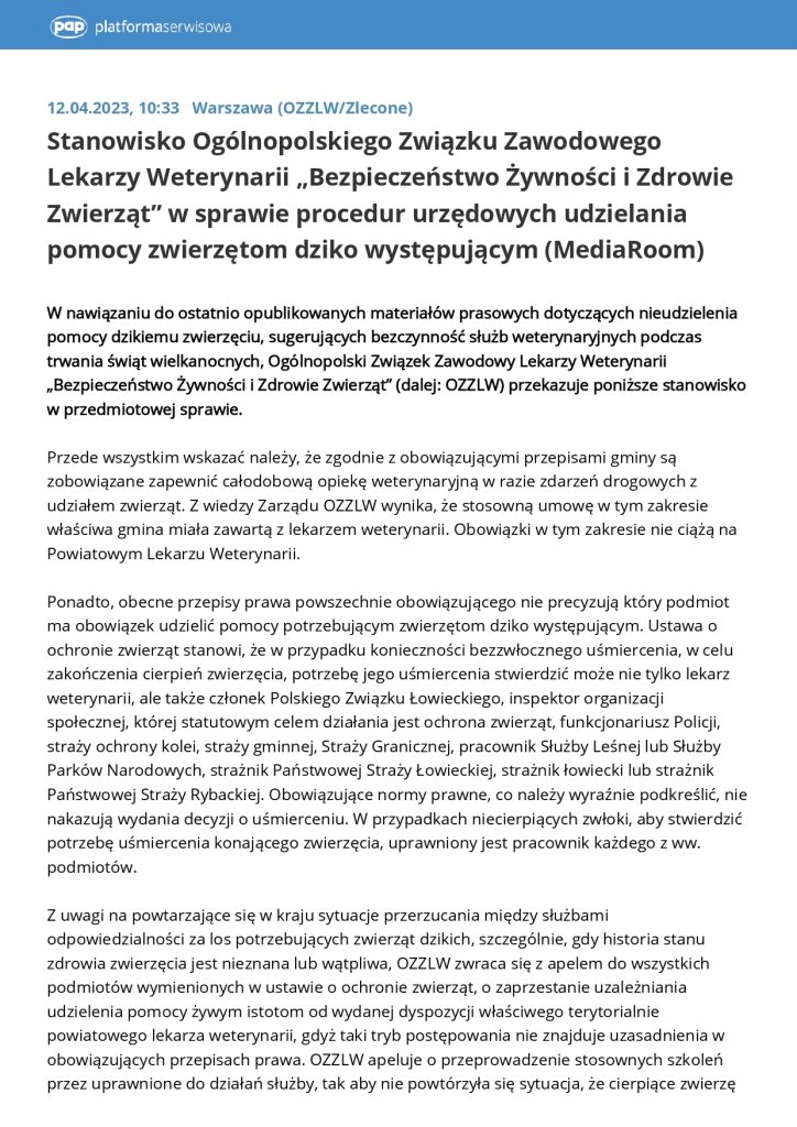 Stanowisko Ogólnopolskiego Związku Zawodowego Lekarzy Weterynarii „Bezpieczeństwo Żywności i Zdrowie Zwierząt” w sprawie procedur urzędowych udzielania pomocy zwierzętom dziko występującym